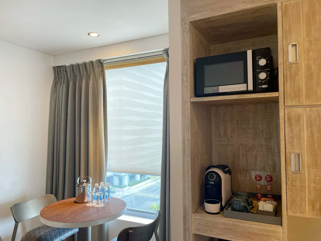 The room has two televisions—a large 55-inch screen in front of the king bed and a smaller one in the kitchen area. There’s also a microwave, a coffee pod brewer, and a mini ref. The bathroom doesn’t have a bathtub, but it does have a bidet and a support arm for PWDs.